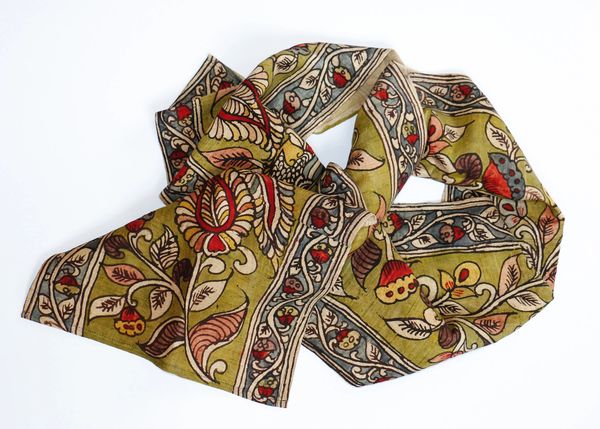This tradition of painting fabrics – kalamkari – has been practiced in South India for generations. Kalamkari textiles are hand-painted with natural colours. The cloths is prepared, painted, and treated in an elaborate manual process.